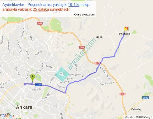 Aydınlıkevler - Peçenek arası yaklaşık olarak 90 km/h ile yukarıda belirtilen sürede olup, iki yerin kuş uçuşu uzaklığı (mesafesi) 13'dir. Yolculuk otobüsle 32 dakika sürmektedir.