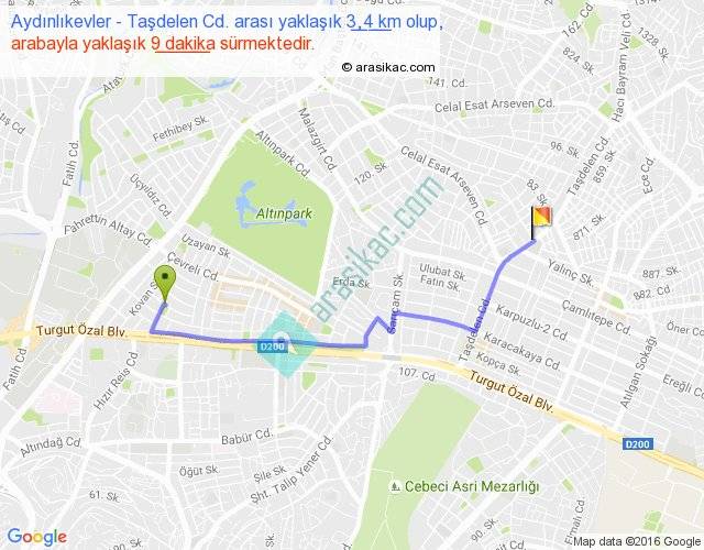 Aydınlıkevler - Taşdelen Cd. arası yaklaşık olarak 90 km/h ile yukarıda belirtilen sürede olup, iki yerin kuş uçuşu uzaklığı (mesafesi) 2'dir. Yolculuk otobüsle 11 dakika sürmektedir.