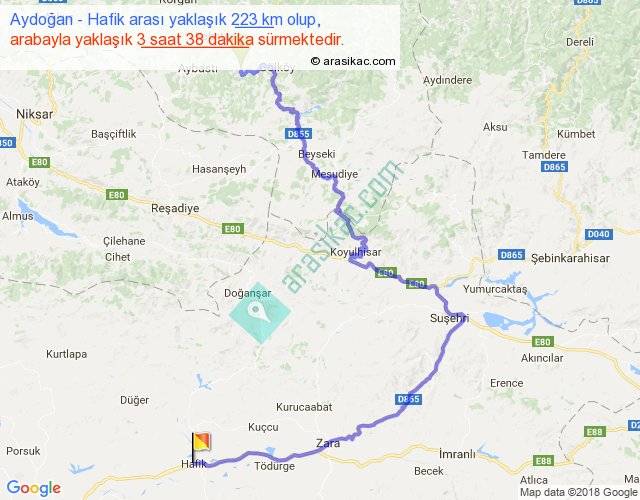 Aydoğan - Hafik arası yaklaşık olarak 90 km/h ile yukarıda belirtilen sürede olup, iki yerin kuş uçuşu uzaklığı (mesafesi) 92'dir. Yolculuk otobüsle 4 saat 43 dakika sürmektedir.