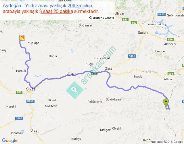 Aydoğan - Yıldız arası yaklaşık olarak 90 km/h ile yukarıda belirtilen sürede olup, iki yerin kuş uçuşu uzaklığı (mesafesi) 129'dir. Yolculuk otobüsle 4 saat 26 dakika sürmektedir.