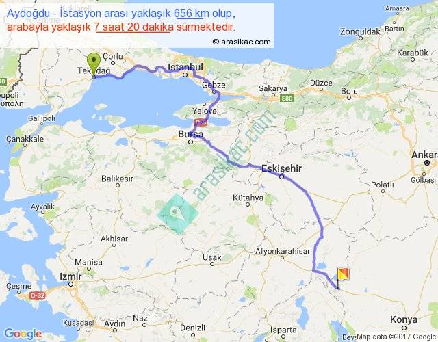 Aydoğdu - İstasyon arası yaklaşık olarak 90 km/h ile yukarıda belirtilen sürede olup, iki yerin kuş uçuşu uzaklığı (mesafesi) 442'dir. Eğer belirtilen yerler arasında uçak seferi var ise bu süre uçakla 40 dakika'ya kadar düşebilir. Yolculuk otobüsle 9 saat 32 dakika sürmektedir.