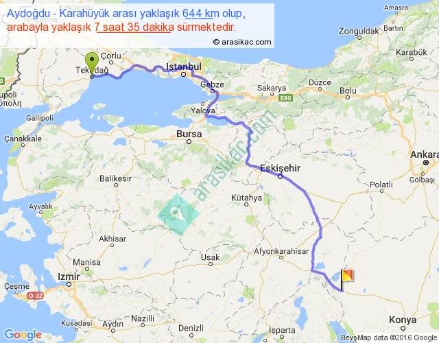 Aydoğdu - Karahüyük arası yaklaşık olarak 90 km/h ile yukarıda belirtilen sürede olup, iki yerin kuş uçuşu uzaklığı (mesafesi) 448'dir. Eğer belirtilen yerler arasında uçak seferi var ise bu süre uçakla 41 dakika'ya kadar düşebilir. Yolculuk otobüsle 9 saat 51 dakika sürmektedir.