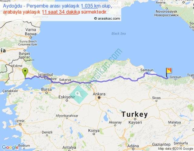 Aydoğdu - Perşembe arası yaklaşık olarak 90 km/h ile yukarıda belirtilen sürede olup, iki yerin kuş uçuşu uzaklığı (mesafesi) 856'dir. Eğer belirtilen yerler arasında uçak seferi var ise bu süre uçakla 1 saat 19 dakika'ya kadar düşebilir. Yolculuk otobüsle 15 saat 2 dakika sürmektedir.