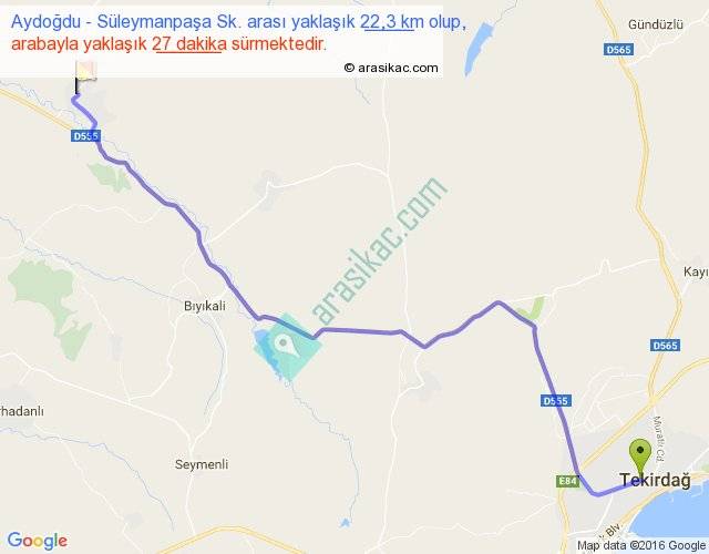 Aydoğdu - Süleymanpaşa Sk. arası yaklaşık olarak 90 km/h ile yukarıda belirtilen sürede olup, iki yerin kuş uçuşu uzaklığı (mesafesi) 18'dir. Yolculuk otobüsle 35 dakika sürmektedir.