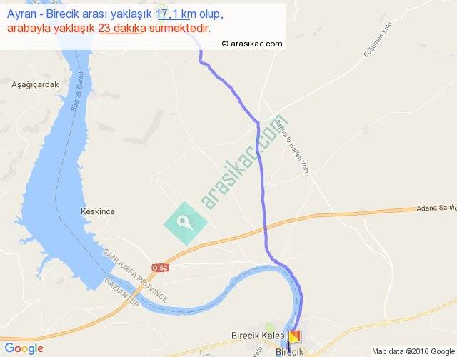 Ayran - Birecik arası yaklaşık olarak 90 km/h ile yukarıda belirtilen sürede olup, iki yerin kuş uçuşu uzaklığı (mesafesi) 15'dir. Yolculuk otobüsle 29 dakika sürmektedir.