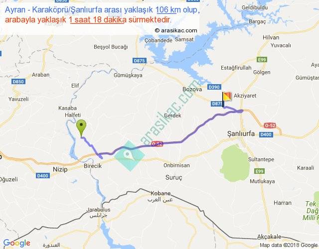Ayran - Karaköprü Şanlıurfa arası yaklaşık olarak 90 km/h ile yukarıda belirtilen sürede olup, iki yerin kuş uçuşu uzaklığı (mesafesi) 70'dir. Yolculuk otobüsle 1 saat 41 dakika sürmektedir.