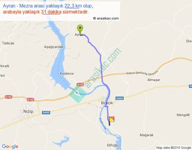 Ayran - Mezra arası yaklaşık olarak 90 km/h ile yukarıda belirtilen sürede olup, iki yerin kuş uçuşu uzaklığı (mesafesi) 19'dir. Yolculuk otobüsle 40 dakika sürmektedir.