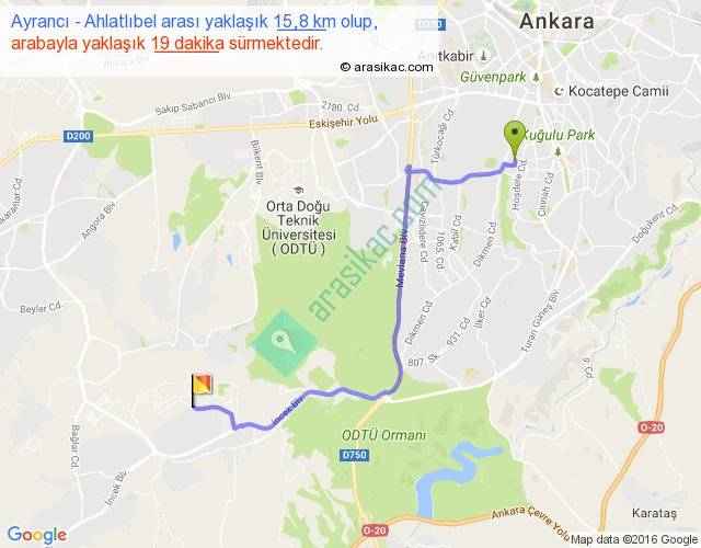 Ayrancı - Ahlatlıbel arası yaklaşık olarak 90 km/h ile yukarıda belirtilen sürede olup, iki yerin kuş uçuşu uzaklığı (mesafesi) 11'dir. Yolculuk otobüsle 24 dakika sürmektedir.