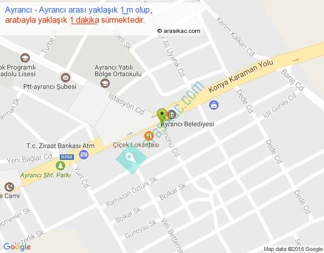 Ayrancı - Ayrancı arası yaklaşık olarak 90 km/h ile yukarıda belirtilen sürede olup, iki yerin kuş uçuşu uzaklığı (mesafesi) 0'dir. Yolculuk otobüsle 1 dakika sürmektedir.