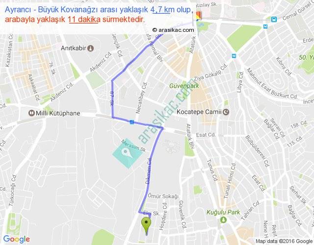 Ayrancı - Büyük Kovanağzı arası yaklaşık olarak 90 km/h ile yukarıda belirtilen sürede olup, iki yerin kuş uçuşu uzaklığı (mesafesi) 3'dir. Yolculuk otobüsle 14 dakika sürmektedir.