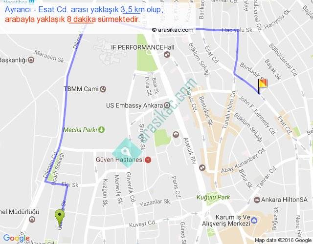 Eğer Ayrancı Esat Cd. arası ne kadar yakar (benzin/mazot) diyorsanız, kilometrede 3 ₺ yakan bir aracınız var ise 9, km'de 4 ₺ yakan bir aracınız var ise 12, km'de 5 ₺ yakan bir aracınız var ise 15 ile bu yolculuğu tamamlayabilirsiniz.