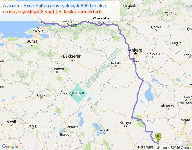 Ayrancı - Eyüp Sultan arası yaklaşık olarak 90 km/h ile yukarıda belirtilen sürede olup, iki yerin kuş uçuşu uzaklığı (mesafesi) 553'dir. Eğer belirtilen yerler arasında uçak seferi var ise bu süre uçakla 51 dakika'ya kadar düşebilir. Yolculuk otobüsle 11 saat 0 dakika sürmektedir.