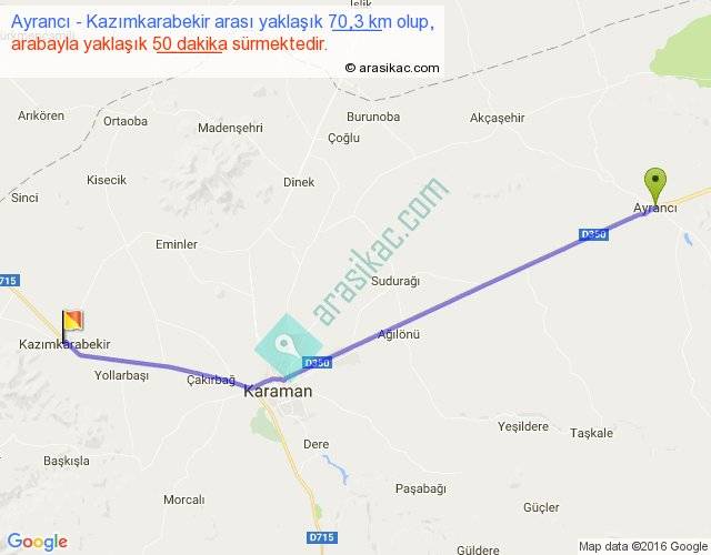 Ayrancı - Kazımkarabekir arası yaklaşık olarak 90 km/h ile yukarıda belirtilen sürede olup, iki yerin kuş uçuşu uzaklığı (mesafesi) 66'dir. Yolculuk otobüsle 1 saat 5 dakika sürmektedir.