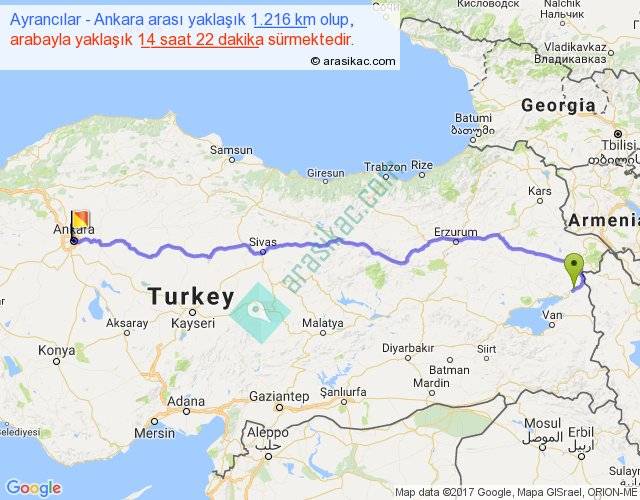 Ayrancılar - Ankara arası yaklaşık olarak 90 km/h ile yukarıda belirtilen sürede olup, iki yerin kuş uçuşu uzaklığı (mesafesi) 942'dir. Eğer belirtilen yerler arasında uçak seferi var ise bu süre uçakla 1 saat 26 dakika'ya kadar düşebilir. Yolculuk otobüsle 18 saat 40 dakika sürmektedir.