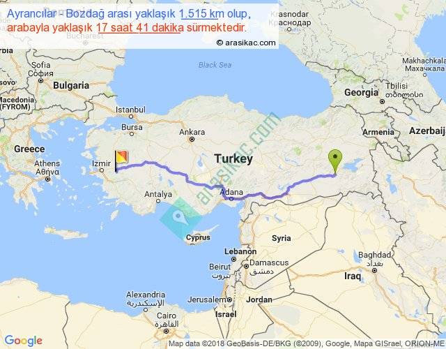 Ayrancılar - Bozdağ arası yaklaşık olarak 90 km/h ile yukarıda belirtilen sürede olup, iki yerin kuş uçuşu uzaklığı (mesafesi) 1197'dir. Eğer belirtilen yerler arasında uçak seferi var ise bu süre uçakla 1 saat 50 dakika'ya kadar düşebilir. Yolculuk otobüsle 22 saat 59 dakika sürmektedir.