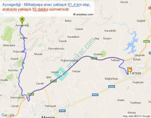 Ayvagediği - Mithatpaşa arası yaklaşık olarak 90 km/h ile yukarıda belirtilen sürede olup, iki yerin kuş uçuşu uzaklığı (mesafesi) 30'dir. Yolculuk otobüsle 1 saat 11 dakika sürmektedir.
