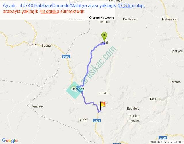 Ayvalı - 44740 Balaban Darende Malatya arası yaklaşık olarak 90 km/h ile yukarıda belirtilen sürede olup, iki yerin kuş uçuşu uzaklığı (mesafesi) 28'dir. Yolculuk otobüsle 1 saat 2 dakika sürmektedir.