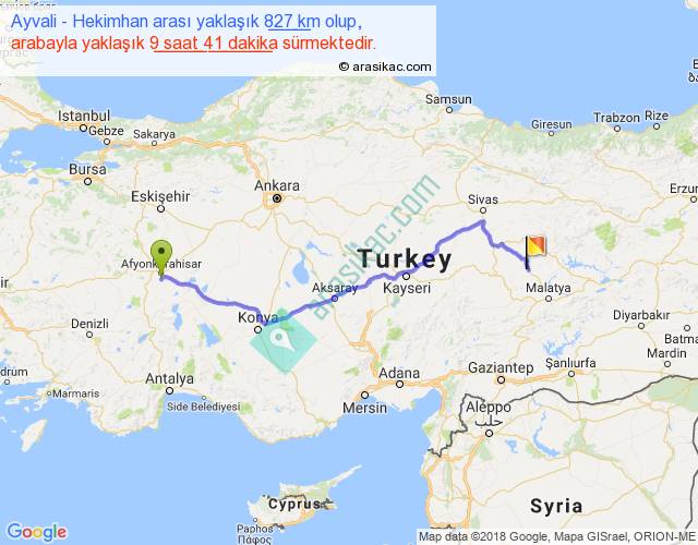 Ayvali - Hekimhan arası yaklaşık olarak 90 km/h ile yukarıda belirtilen sürede olup, iki yerin kuş uçuşu uzaklığı (mesafesi) 638'dir. Eğer belirtilen yerler arasında uçak seferi var ise bu süre uçakla 58 dakika'ya kadar düşebilir. Yolculuk otobüsle 12 saat 35 dakika sürmektedir.