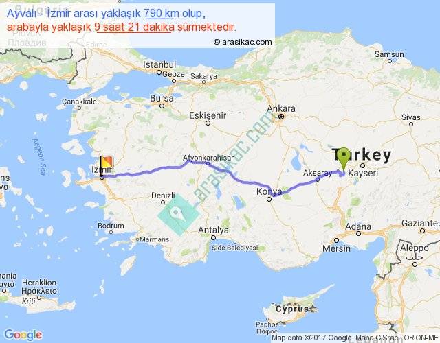 Ayvalı - İzmir arası yaklaşık olarak 90 km/h ile yukarıda belirtilen sürede olup, iki yerin kuş uçuşu uzaklığı (mesafesi) 669'dir. Eğer belirtilen yerler arasında uçak seferi var ise bu süre uçakla 1 saat 01 dakika'ya kadar düşebilir. Yolculuk otobüsle 12 saat 9 dakika sürmektedir.