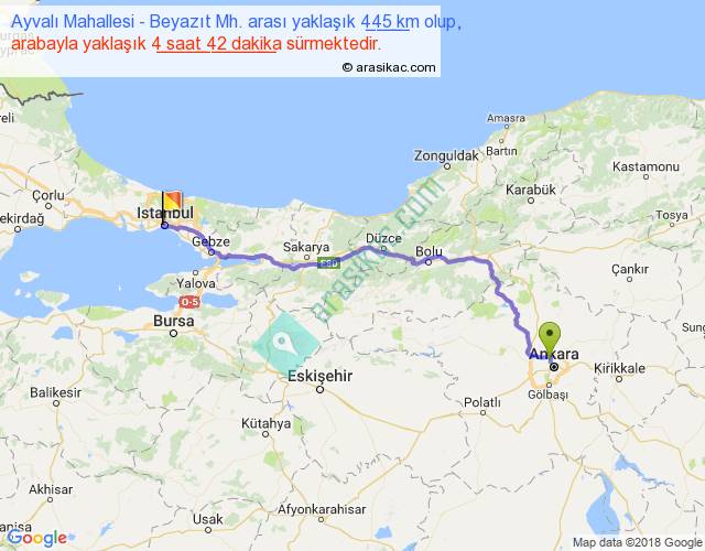 Ayvalı Mahallesi - Beyazıt Mh. arası yaklaşık olarak 90 km/h ile yukarıda belirtilen sürede olup, iki yerin kuş uçuşu uzaklığı (mesafesi) 343'dir. Eğer belirtilen yerler arasında uçak seferi var ise bu süre uçakla 31 dakika'ya kadar düşebilir. Yolculuk otobüsle 6 saat 6 dakika sürmektedir.
