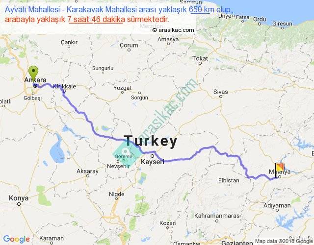 Ayvalı Mahallesi - Karakavak Mahallesi arası yaklaşık olarak 90 km/h ile yukarıda belirtilen sürede olup, iki yerin kuş uçuşu uzaklığı (mesafesi) 500'dir. Eğer belirtilen yerler arasında uçak seferi var ise bu süre uçakla 46 dakika'ya kadar düşebilir. Yolculuk otobüsle 10 saat 5 dakika sürmektedir.
