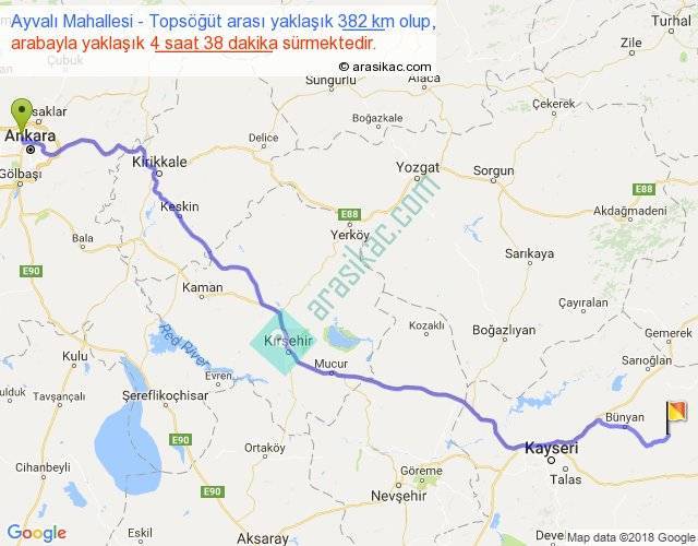Ayvalı Mahallesi - Topsöğüt arası yaklaşık olarak 90 km/h ile yukarıda belirtilen sürede olup, iki yerin kuş uçuşu uzaklığı (mesafesi) 306'dir. Eğer belirtilen yerler arasında uçak seferi var ise bu süre uçakla 28 dakika'ya kadar düşebilir. Yolculuk otobüsle 6 saat 1 dakika sürmektedir.