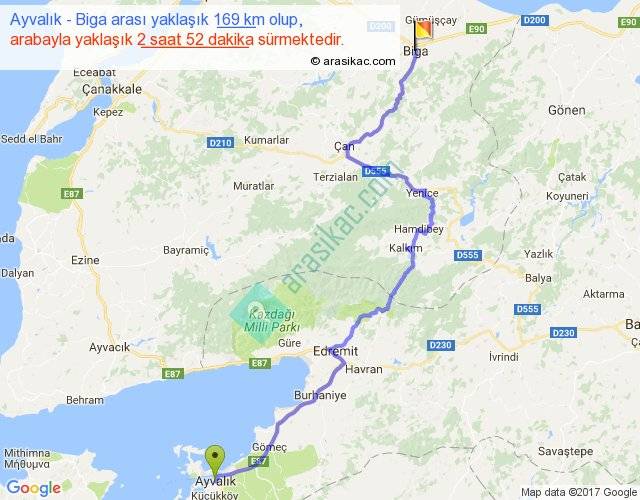 Ayvalık - Biga arası yaklaşık olarak 90 km/h ile yukarıda belirtilen sürede olup, iki yerin kuş uçuşu uzaklığı (mesafesi) 111'dir. Yolculuk otobüsle 3 saat 43 dakika sürmektedir.