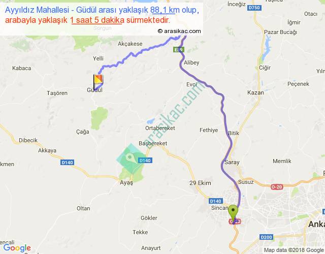 Ayyıldız Mahallesi - Güdül arası yaklaşık olarak 90 km/h ile yukarıda belirtilen sürede olup, iki yerin kuş uçuşu uzaklığı (mesafesi) 44'dir. Yolculuk otobüsle 1 saat 24 dakika sürmektedir.