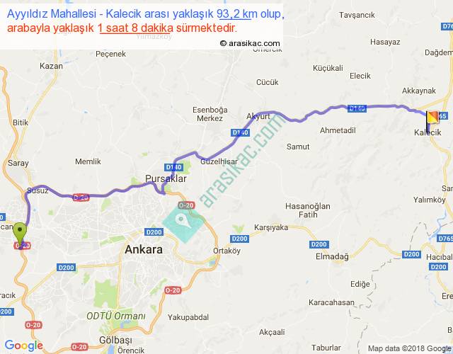 Ayyıldız Mahallesi - Kalecik arası yaklaşık olarak 90 km/h ile yukarıda belirtilen sürede olup, iki yerin kuş uçuşu uzaklığı (mesafesi) 70'dir. Yolculuk otobüsle 1 saat 28 dakika sürmektedir.