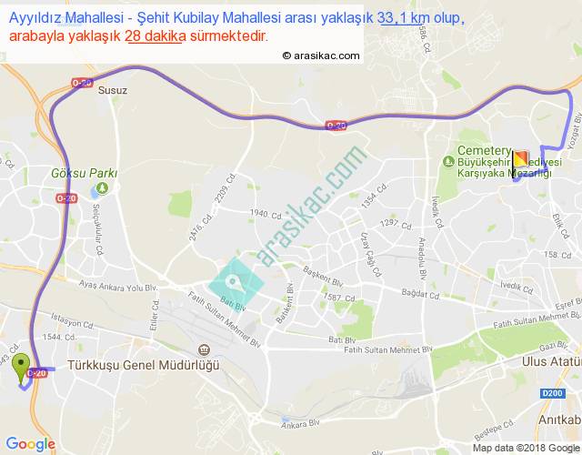 Ayyıldız Mahallesi - Şehit Kubilay Mahallesi arası yaklaşık olarak 90 km/h ile yukarıda belirtilen sürede olup, iki yerin kuş uçuşu uzaklığı (mesafesi) 17'dir. Yolculuk otobüsle 36 dakika sürmektedir.