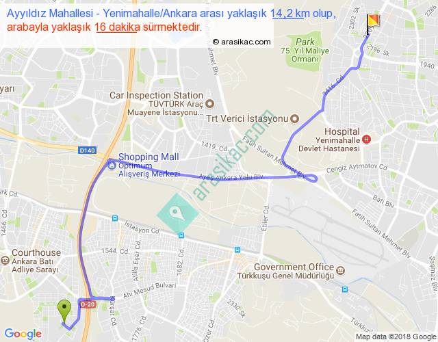 Ayyıldız Mahallesi - Yenimahalle Ankara arası yaklaşık olarak 90 km/h ile yukarıda belirtilen sürede olup, iki yerin kuş uçuşu uzaklığı (mesafesi) 9'dir. Yolculuk otobüsle 20 dakika sürmektedir.