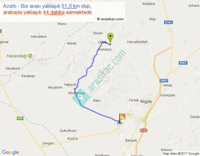 Azatlı - Bor arası yaklaşık olarak 90 km/h ile yukarıda belirtilen sürede olup, iki yerin kuş uçuşu uzaklığı (mesafesi) 30'dir. Yolculuk otobüsle 57 dakika sürmektedir.