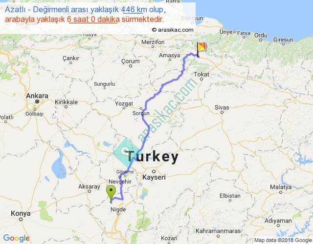 Azatlı - Değirmenli arası yaklaşık olarak 90 km/h ile yukarıda belirtilen sürede olup, iki yerin kuş uçuşu uzaklığı (mesafesi) 326'dir. Eğer belirtilen yerler arasında uçak seferi var ise bu süre uçakla 30 dakika'ya kadar düşebilir. Yolculuk otobüsle 7 saat 48 dakika sürmektedir.