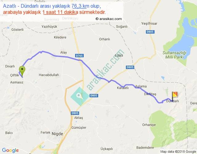 Azatlı - Dündarlı arası yaklaşık olarak 90 km/h ile yukarıda belirtilen sürede olup, iki yerin kuş uçuşu uzaklığı (mesafesi) 59'dir. Yolculuk otobüsle 1 saat 32 dakika sürmektedir.