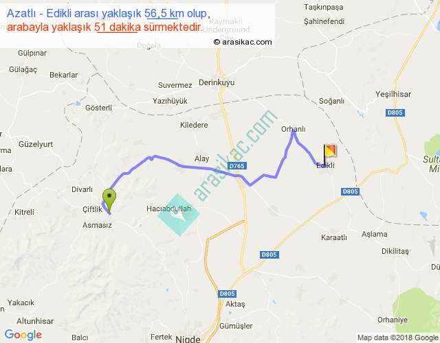 Azatlı - Edikli arası yaklaşık olarak 90 km/h ile yukarıda belirtilen sürede olup, iki yerin kuş uçuşu uzaklığı (mesafesi) 38'dir. Yolculuk otobüsle 1 saat 6 dakika sürmektedir.