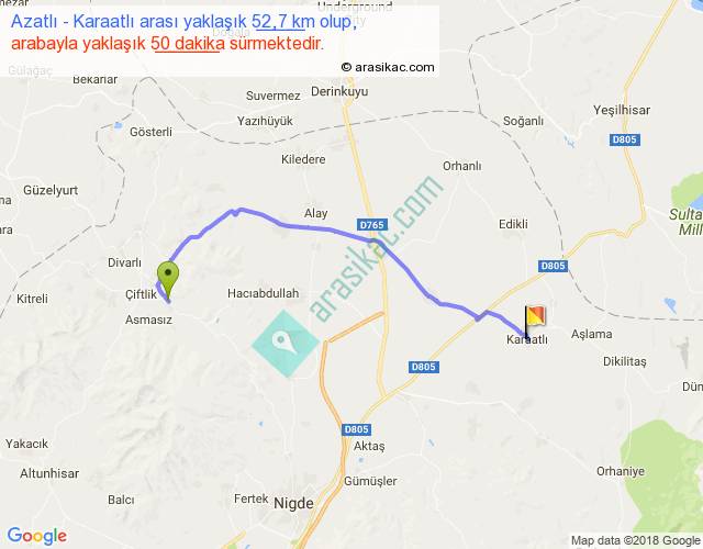 Azatlı - Karaatlı arası yaklaşık olarak 90 km/h ile yukarıda belirtilen sürede olup, iki yerin kuş uçuşu uzaklığı (mesafesi) 39'dir. Yolculuk otobüsle 1 saat 5 dakika sürmektedir.