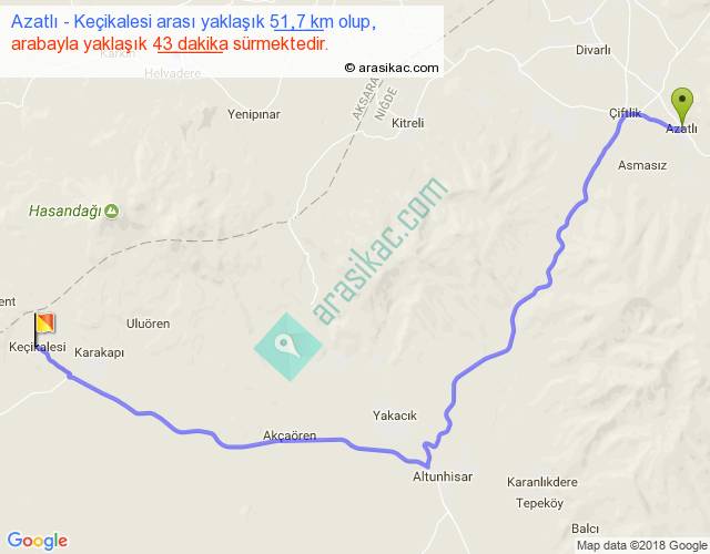 Azatlı - Keçikalesi arası yaklaşık olarak 90 km/h ile yukarıda belirtilen sürede olup, iki yerin kuş uçuşu uzaklığı (mesafesi) 37'dir. Yolculuk otobüsle 55 dakika sürmektedir.