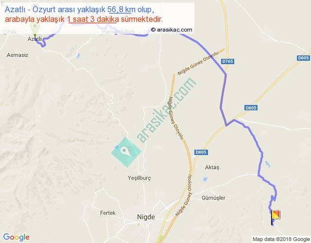 Azatlı - Özyurt arası yaklaşık olarak 90 km/h ile yukarıda belirtilen sürede olup, iki yerin kuş uçuşu uzaklığı (mesafesi) 37'dir. Yolculuk otobüsle 1 saat 21 dakika sürmektedir.