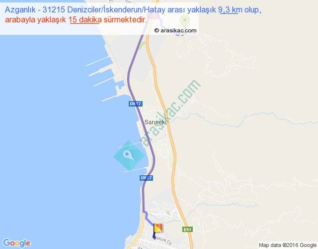 Azganlık - 31215 Denizciler İskenderun Hatay arası yaklaşık olarak 90 km/h ile yukarıda belirtilen sürede olup, iki yerin kuş uçuşu uzaklığı (mesafesi) 6'dir. Yolculuk otobüsle 19 dakika sürmektedir.