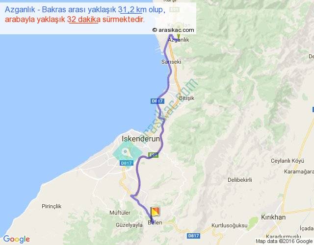 Azganlık - Bakras arası yaklaşık olarak 90 km/h ile yukarıda belirtilen sürede olup, iki yerin kuş uçuşu uzaklığı (mesafesi) 23'dir. Yolculuk otobüsle 41 dakika sürmektedir.
