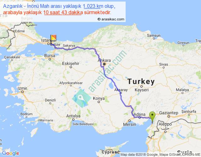 Azganlık - İnönü Mah arası yaklaşık olarak 90 km/h ile yukarıda belirtilen sürede olup, iki yerin kuş uçuşu uzaklığı (mesafesi) 771'dir. Eğer belirtilen yerler arasında uçak seferi var ise bu süre uçakla 1 saat 11 dakika'ya kadar düşebilir. Yolculuk otobüsle 13 saat 55 dakika sürmektedir.