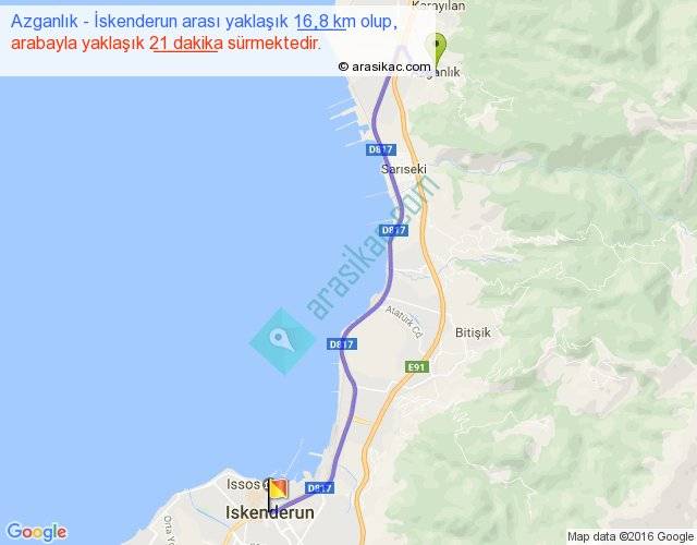Azganlık - İskenderun arası yaklaşık olarak 90 km/h ile yukarıda belirtilen sürede olup, iki yerin kuş uçuşu uzaklığı (mesafesi) 13'dir. Yolculuk otobüsle 27 dakika sürmektedir.