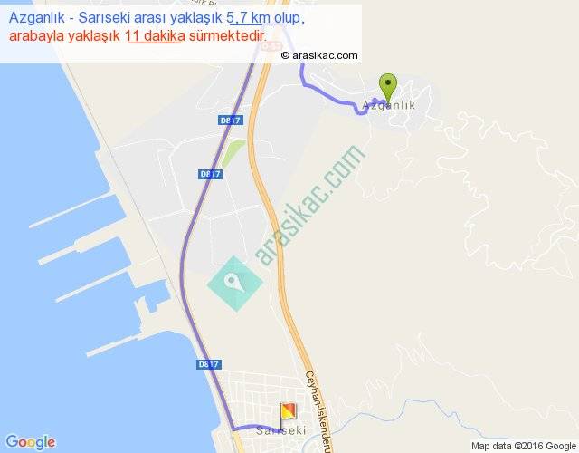 Azganlık - Sarıseki arası yaklaşık olarak 90 km/h ile yukarıda belirtilen sürede olup, iki yerin kuş uçuşu uzaklığı (mesafesi) 3'dir. Yolculuk otobüsle 14 dakika sürmektedir.