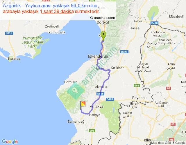 Azganlık - Yaylıca arası yaklaşık olarak 90 km/h ile yukarıda belirtilen sürede olup, iki yerin kuş uçuşu uzaklığı (mesafesi) 61'dir. Yolculuk otobüsle 2 saat 8 dakika sürmektedir.