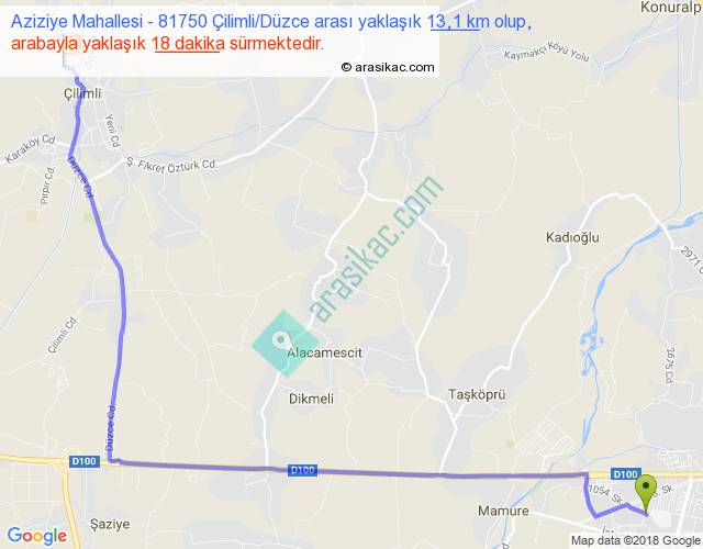 Aziziye Mahallesi - 81750 Çilimli Düzce arası yaklaşık olarak 90 km/h ile yukarıda belirtilen sürede olup, iki yerin kuş uçuşu uzaklığı (mesafesi) 10'dir. Yolculuk otobüsle 23 dakika sürmektedir.