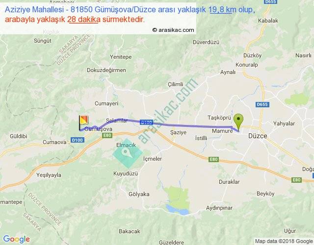 Aziziye Mahallesi - 81850 Gümüşova Düzce arası yaklaşık olarak 90 km/h ile yukarıda belirtilen sürede olup, iki yerin kuş uçuşu uzaklığı (mesafesi) 19'dir. Yolculuk otobüsle 36 dakika sürmektedir.