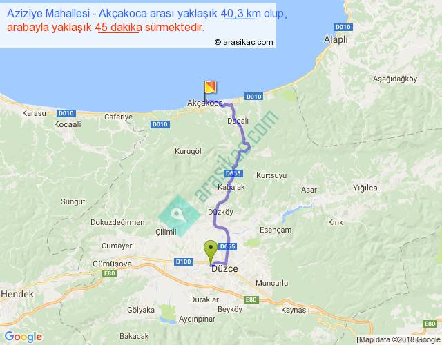 Aziziye Mahallesi - Akçakoca arası yaklaşık olarak 90 km/h ile yukarıda belirtilen sürede olup, iki yerin kuş uçuşu uzaklığı (mesafesi) 27'dir. Yolculuk otobüsle 58 dakika sürmektedir.