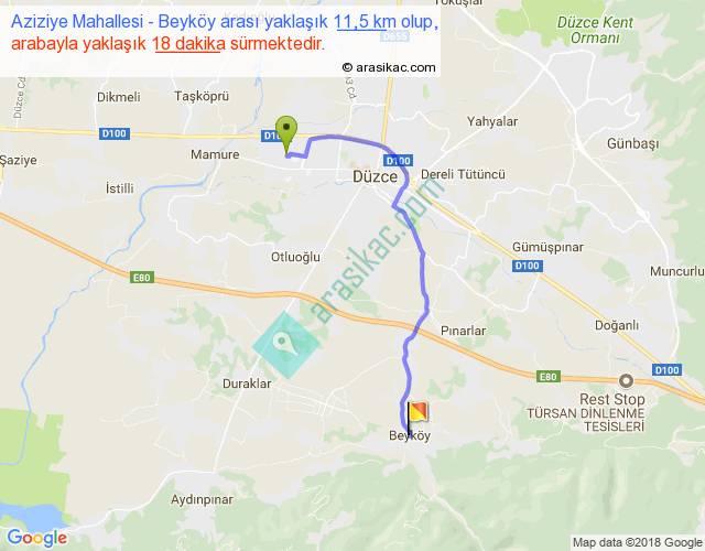 Aziziye Mahallesi - Beyköy arası yaklaşık olarak 90 km/h ile yukarıda belirtilen sürede olup, iki yerin kuş uçuşu uzaklığı (mesafesi) 8'dir. Yolculuk otobüsle 23 dakika sürmektedir.