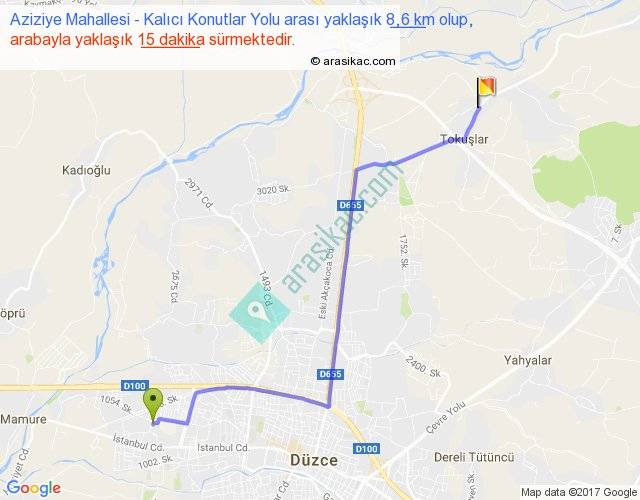 Aziziye Mahallesi - Kalıcı Konutlar Yolu arası yaklaşık olarak 90 km/h ile yukarıda belirtilen sürede olup, iki yerin kuş uçuşu uzaklığı (mesafesi) 7'dir. Yolculuk otobüsle 19 dakika sürmektedir.
