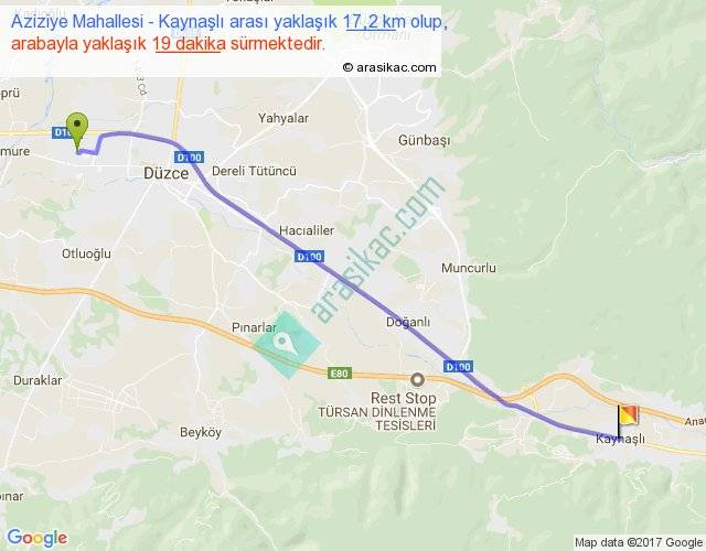 Eğer Aziziye Mahallesi Kaynaşlı arası ne kadar yakar (benzin/mazot) diyorsanız, kilometrede 3 ₺ yakan bir aracınız var ise 51, km'de 4 ₺ yakan bir aracınız var ise 68, km'de 5 ₺ yakan bir aracınız var ise 85 ile bu yolculuğu tamamlayabilirsiniz.